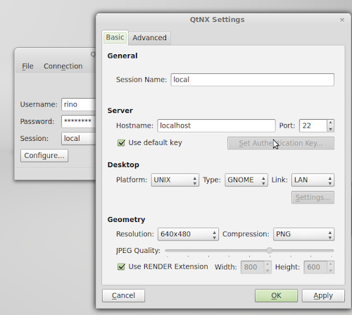 Diamo un nome alla sessione, impostiamo l’indirizzo del server appena installato su “localhost” (perchè ci colleghiamo alla stessa macchina in cui abbiamo appena installato il server oppure metteremo un indirizzo IP o un indirizzo web se il server fosse situato in un posto geografico diverso), impostiamo il tipo di desktop che vogliamo usare e la risoluzione dello schermo e infine clicchiamo su Apply e OK chiudendo così la configurazione.